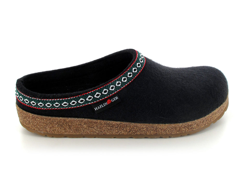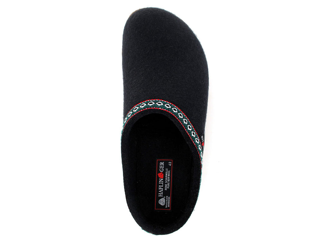 Product: 'Franzl' by HAFLINGER embodies alpine style and tradition. Available in various colors and sizes, these slipper clogs feature a Tyrolean-styled trim and are made entirely of natural materials.