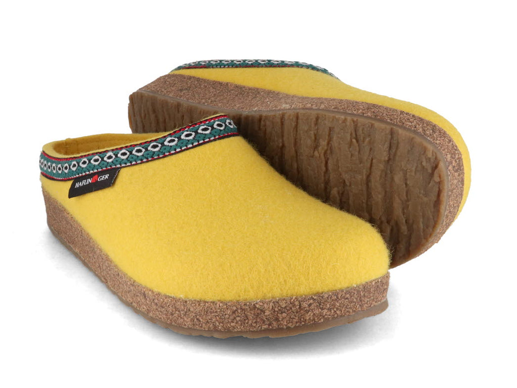 The HAFLINGER Women Felt Clogs ‘Grizzly Franzl’ in yellow feature a 100% pure wool felt upper that offers excellent breathability to keep feet comfortable and dry. An anatomical cork footbed provides ergonomic support by adapting to your foot’s natural shape, promoting proper alignment. The slip-resistant rubber sole ensures secure footing, making these clogs both practical and comfortable for everyday wear.