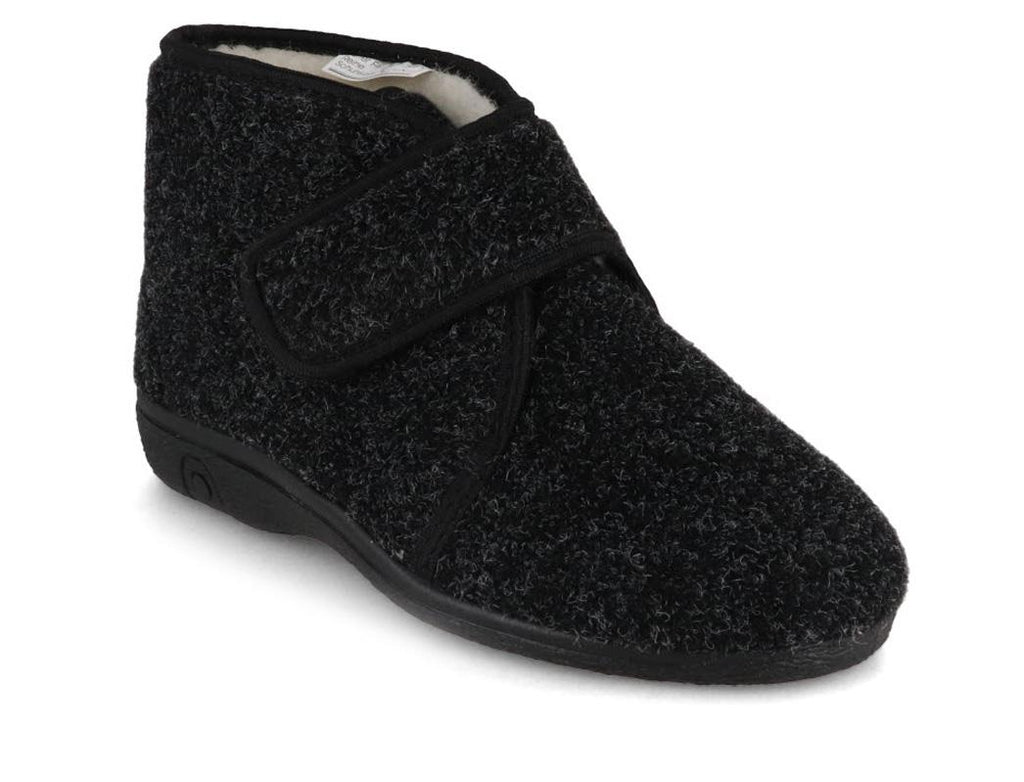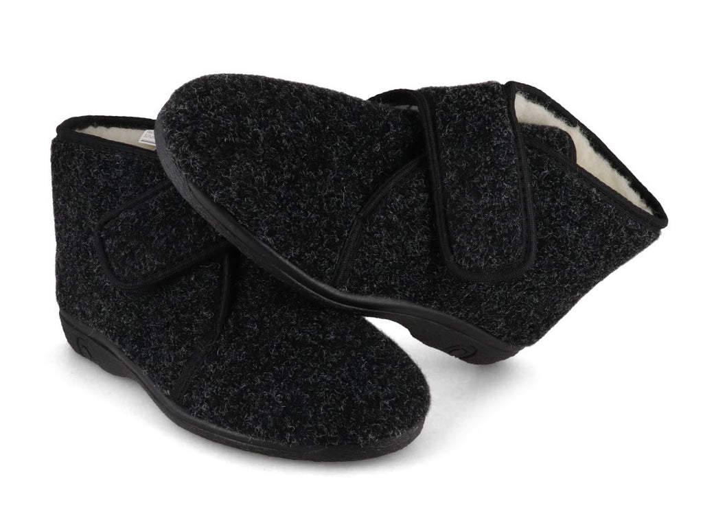 The Varomed Vital Slipper Boots in black feature a breathable wool upper and a natural new wool lining that ensures optimal temperature regulation and comfort. Equipped with a wide slip-on design and an adjustable Velcro fastener, they provide a secure yet flexible fit. The durable rubber sole offers reliable traction and support, making these slippers ideal for daily wear while prioritizing foot health and ease of use.